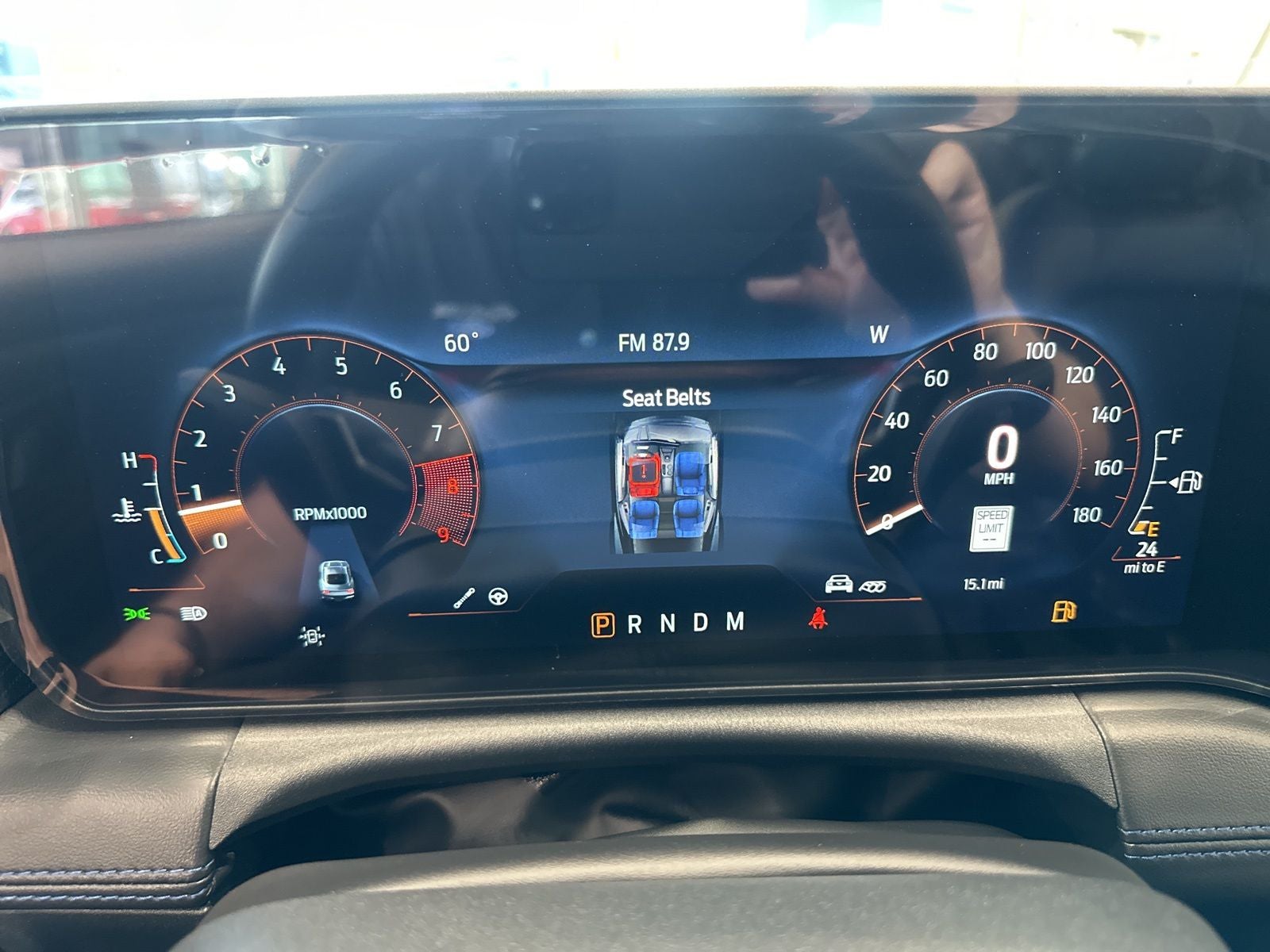 Inside the Dark Horse Premium cabin, performance meets modern comfort. Dinamica trimmed seating, a leather-wrapped heated steering wheel, and illuminated Dark Horse badging create a distinctive performance environment. The 12.4-inch digital instrument cluster and 13.2-inch center touchscreen powered by SYNC 4 deliver a fully digital cockpit experience, while ambient lighting and premium materials elevate the driving experience.