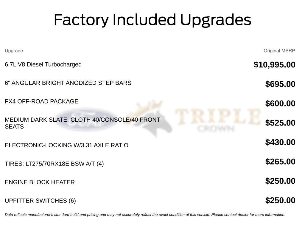 At Triple Crown Ford, we specialize in Super Duty sales with upfront pricing, no hidden add-ons, and a team that understands the needs of Texas truck owners. Whether pulling livestock, hauling equipment, or outfitting a work fleet, customers across Stephenville, Weatherford, Granbury, and Fort Worth trust us for quality service and trucks that are Built Ford Tough. Price includes: $1000 - Retail Customer Cash. Exp. 03/31/2026