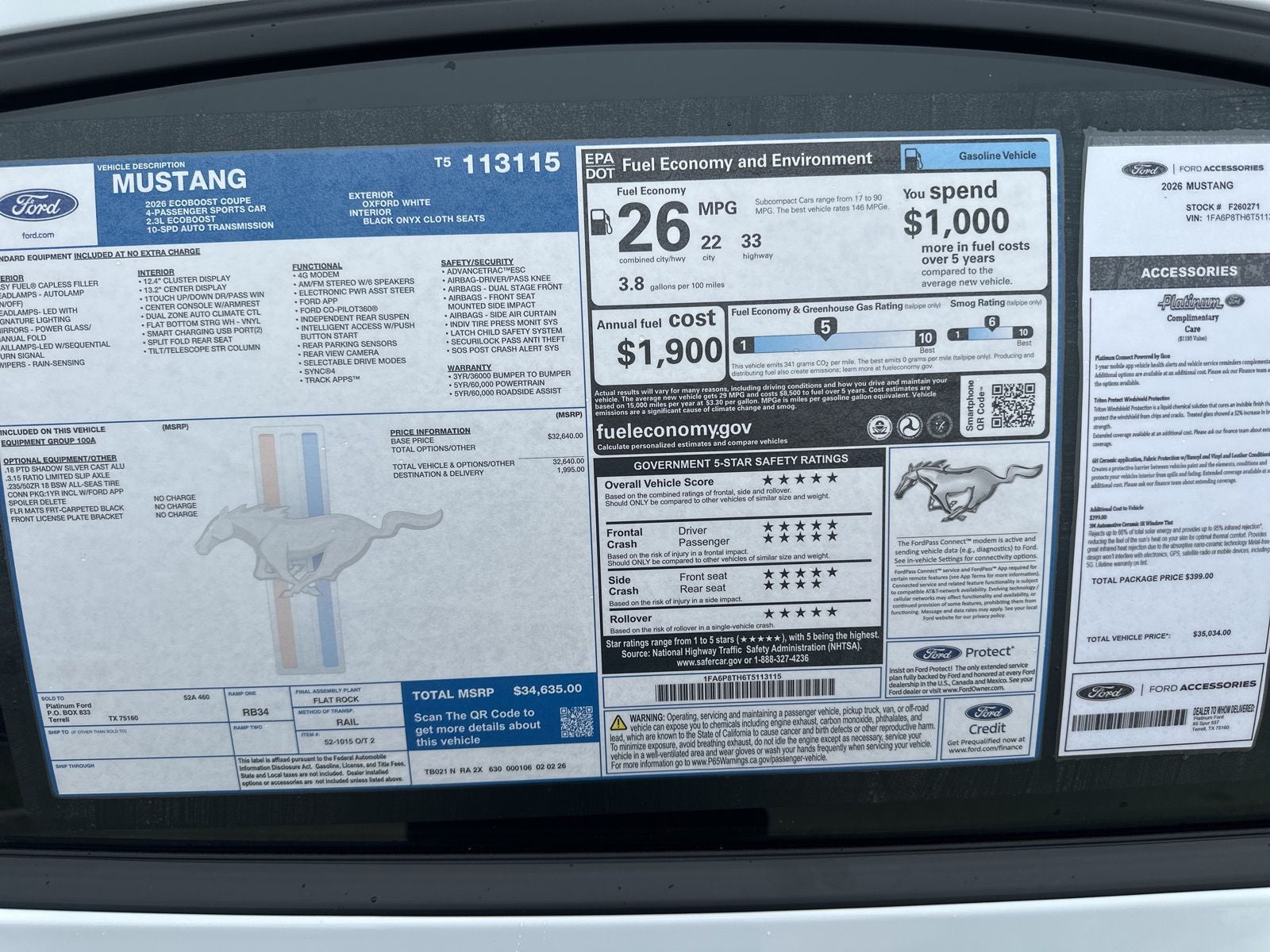 The 2026 Ford Mustang EcoBoost Coupe in Oxford White delivers the unmistakable performance and style Mustang is known for, combined with modern technology and impressive efficiency. Powered by the turbocharged 2.3L EcoBoost engine paired with a smooth 10-speed automatic transmission, this Mustang offers thrilling acceleration and responsive handling while achieving an estimated 26 MPG combined (22 city / 33 highway).