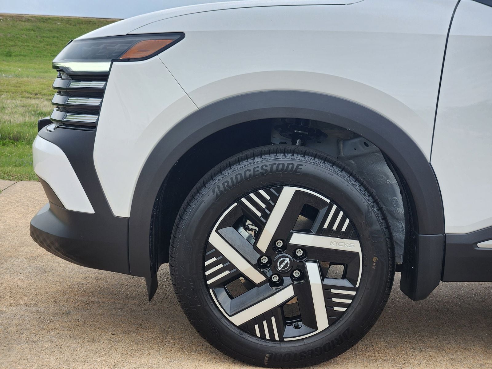 This 2026 Nissan Kicks SV in Fresh Powder comes with the following features: Charging Package (USB Charging Cable Set - Nissan and USB-C Power Delivery), Cold Weather Package (Heated Front Seats, Heated Mirrors, and Rear Floor Heater Ducts), 4 Speakers, 4-Wheel Disc Brakes, ABS brakes, Air Conditioning, AM/FM radio, Auto High-beam Headlights, Automatic temperature control, Blind Spot Warning, Brake assist, Bumpers: body-color, Carpeted Floor Mats and Underfloor Protector, Cloth Seat Trim, Crossbars, Door Trim Panel Scuff Plates, Driver door bin, Driver vanity mirror, Dual front impact airbags, Dual front side impact airbags, Electronic Stability Control, Emergency communication system, Exterior Parking Camera Rear, Front anti-roll bar, Front Bucket Seats, Front Center Armrest, Front reading lights, Front wheel independent suspension, Fully automatic headlights, Illuminated entry, Knee airbag, Low tire pressure warning, NissanConnect featuring Apple CarPlay and Android Auto, Occupant sensing airbag, Outside temperature display, Overhead airbag, Panic alarm, Passenger door bin, Passenger vanity mirror, Power door mirrors, Power steering, Power windows, Radio data system, Radio: AM/FM/SiriusXM Audio System, Rear anti-roll bar, Rear reading lights, Rear side impact airbag, Rear window defroster, Rear window wiper, Remote keyless entry, Security system, Speed control, Speed-sensing steering, Splash Guards, Split folding rear seat, Spoiler, Sport steering wheel, Steering wheel mounted audio controls, Tachometer, Telescoping steering wheel, Tilt steering wheel, Traction control, Trip computer, Variably intermittent wipers, and Wheels: 17 Steel Flex with Full Covers. 28/35 City/Highway MPG