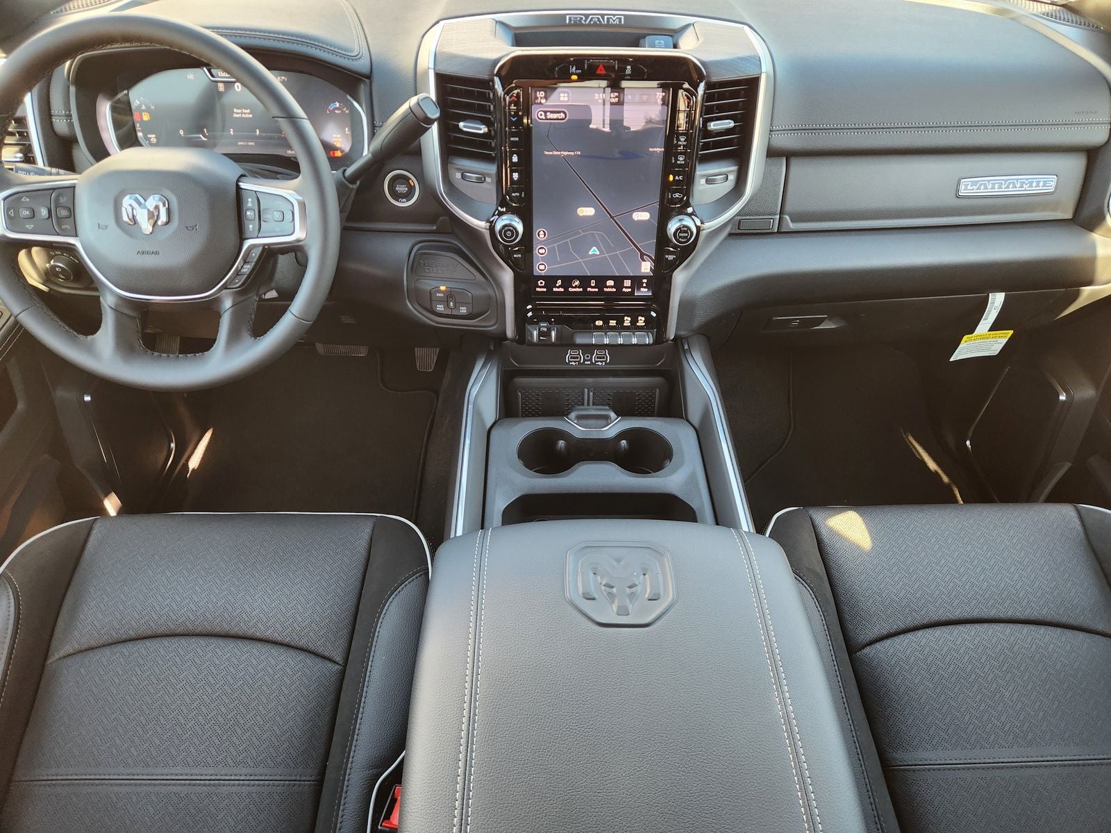 The Laramie's interior is a masterclass in refined craftsmanship, with premium leather-trimmed bucket seats, a full-length upgraded floor console, and a host of advanced technology features. Enjoy the convenience of ventilated front seats, a heated steering wheel, and a dual wireless charging pad. Stay connected with the Uconnect 5 Nav system featuring a massive 12-inch display.