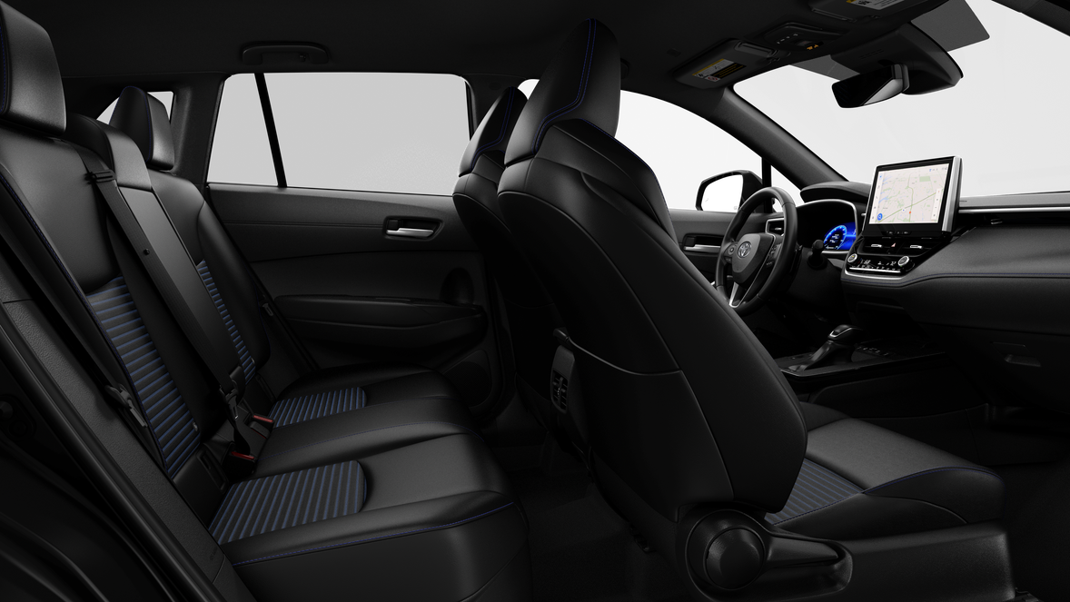 The Corolla Cross Hybrid XSE's interior is designed with your comfort and convenience in mind. Enjoy the luxury of a tilt and telescoping steering wheel, automatic climate control, and a premium audio system with 6 speakers. The spacious cabin and versatile 60/40 split-folding rear seats offer ample room for passengers and cargo.