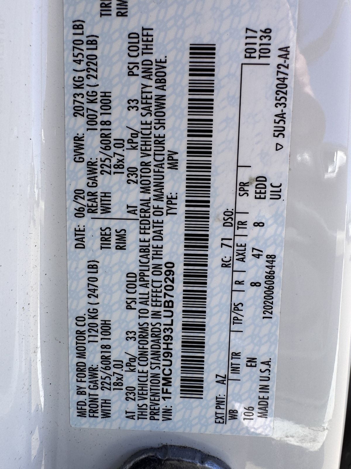 The 2020 Ford Escape SEL AWD delivers a strong combination of efficiency, comfort, and advanced technology in a sleek, modern SUV. Finished in Star White Metallic Tri-Coat with a Sandstone ActiveX™ interior, this Escape offers refined styling along with the versatility needed for daily driving and road trips.