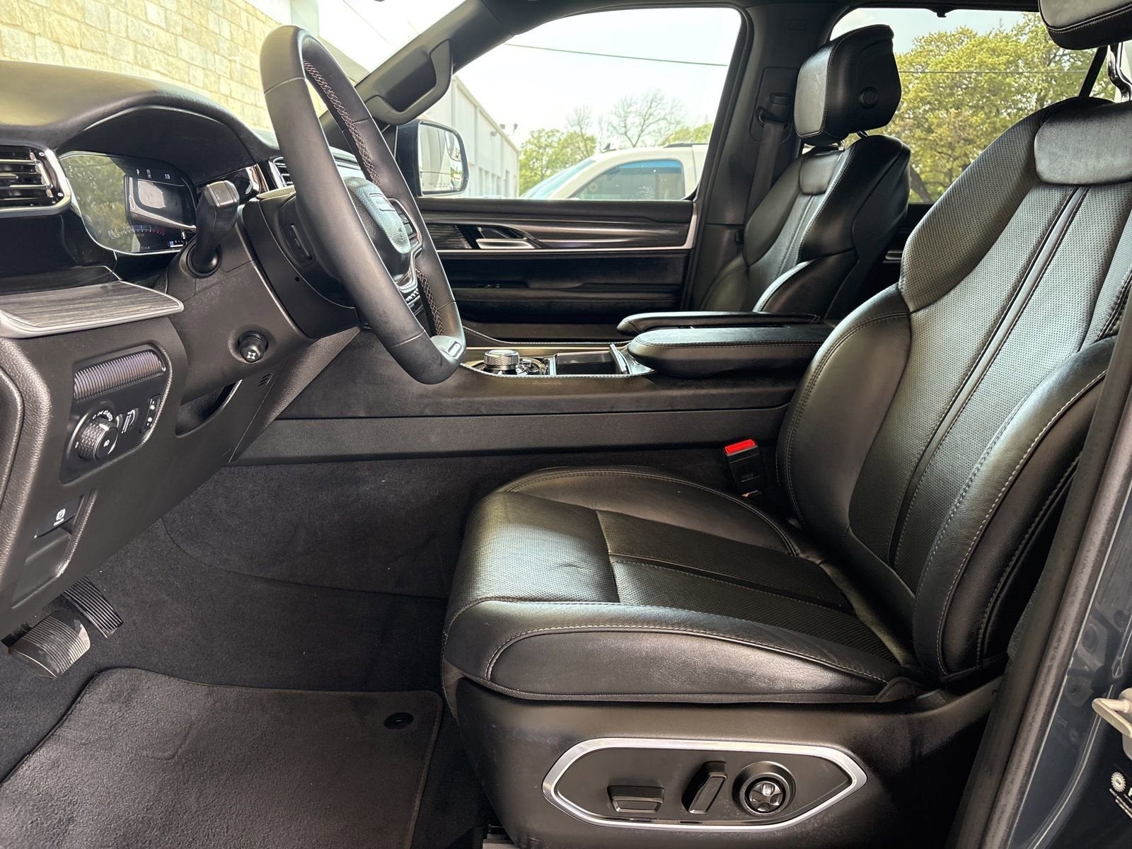 This vehicle comes nicely equipped with Convenience Group I (2nd Row Manual Window Shades, Drowsy Driver Detection, Intersection Collision Assist System, P&P Park & Unpark Assist w/Stop System, Rack Cargo Management System, Surround View Camera System, and Traffic Sign Recognition), Flexible Seating Group (7-Passenger Seating, Floor Console w/Cupholder, and Power Tip/Slide Recline 2nd Row Buckets), Preferred Equipment Group (Heads-Up Display, Quadra-Lift Air Suspension, and Semi Active Damping), Premium Group I (19 Speaker McIntosh Audio System, 3 Panel Sunroof, Adjustable Roof Rail Crossbars, Luxury Front & Rear Floor Mats, Power Deployable Running Boards, Reversible Carpet/Vinyl Cargo Mat, and Wheels: 22 x 9.0 Premium 3 Aluminum), Quick Order Package 25N, Titanium Certified Certified, River Rock, Black Leather, 10 Speakers, 20 x 9.0 Aluminum Wheels, 3.55 Rear Axle Ratio, 3rd row seats: bench, 4-Wheel Disc Brakes, ABS brakes, Adjustable pedals, Air Conditioning, Alloy wheels, AM/FM radio: SiriusXM with 360L, Anti-whiplash front head restraints, Audio memory, Auto High-beam Headlights, Auto-dimming door mirrors, Auto-dimming Rear-View mirror, Auto-leveling suspension, Automatic temperature control, Brake assist, Bumpers: body-color, Compass, Delay-off headlights, Driver door bin, Driver vanity mirror, Driver's Seat Mounted Armrest, Dual front impact airbags, Dual front side impact airbags, Electronic Stability Control, Emergency communication system: Automatic SOS Call, Exterior Parking Camera Rear, Four wheel independent suspension, Front anti-roll bar, Front Bucket Seats, Front Center Armrest w/Storage, Front dual zone A/C, Front fog lights, Front Passenger Interactive Display, Front reading lights, Fully automatic headlights, Garage door transmitter, Genuine wood console insert, Genuine wood dashboard insert, Genuine wood door panel insert, Heated door mirrors, Heated front seats, Heated rear seats, Heated steering wheel, Illuminated entry, Knee airbag, Leather Trimmed Bucket Seats, Low tire pressure warning, Memory seat, Navigation System, Normal Duty Suspension, Occupant sensing airbag, Outside temperature display, Overhead airbag, Overhead console, Panic alarm, Passenger door bin, Passenger seat mounted armrest, Passenger vanity mirror, Pedal memory, Power adjustable front head restraints, Power door mirrors, Power driver seat, Power Liftgate, Power passenger seat, Power steering, Power windows, Radio data system, Radio: Uconnect 5 Nav w/10.1 Display, Rain sensing wipers, Rear air conditioning, Rear anti-roll bar, Rear reading lights, Rear seat center armrest, Rear window defroster, Rear window wiper, Reclining 3rd row seat, Remote keyless entry, Security system, Speed control, Speed-sensing steering, Speed-Sensitive Wipers, Split folding rear seat, Steering wheel memory, Steering wheel mounted audio controls, Tachometer, Telescoping steering wheel, Tilt steering wheel, Traction control, Trip computer, Turn signal indicator mirrors, Variably intermittent wipers, Ventilated front seats, and Voltmeter.